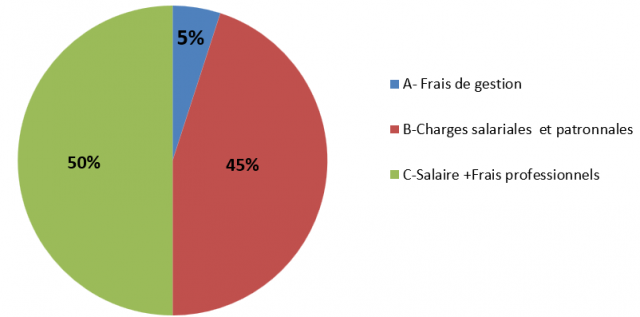 En tant que salarié porté, vous devez vous acquitter des charges sociales (salariales et  patronales) mais aussi des frais de gestion de la société de portage. Le montant des frais se répartit de la façon suivante :